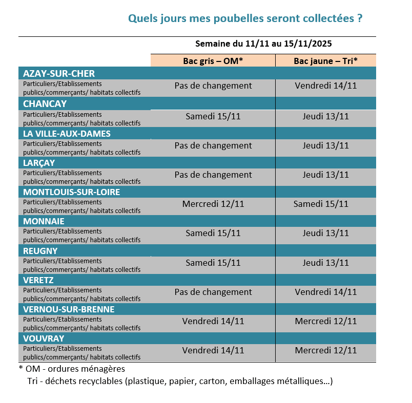 Le tri sera collecté le jeudi 13 novembre et les ordures ménagères le samedi 15 novembre.