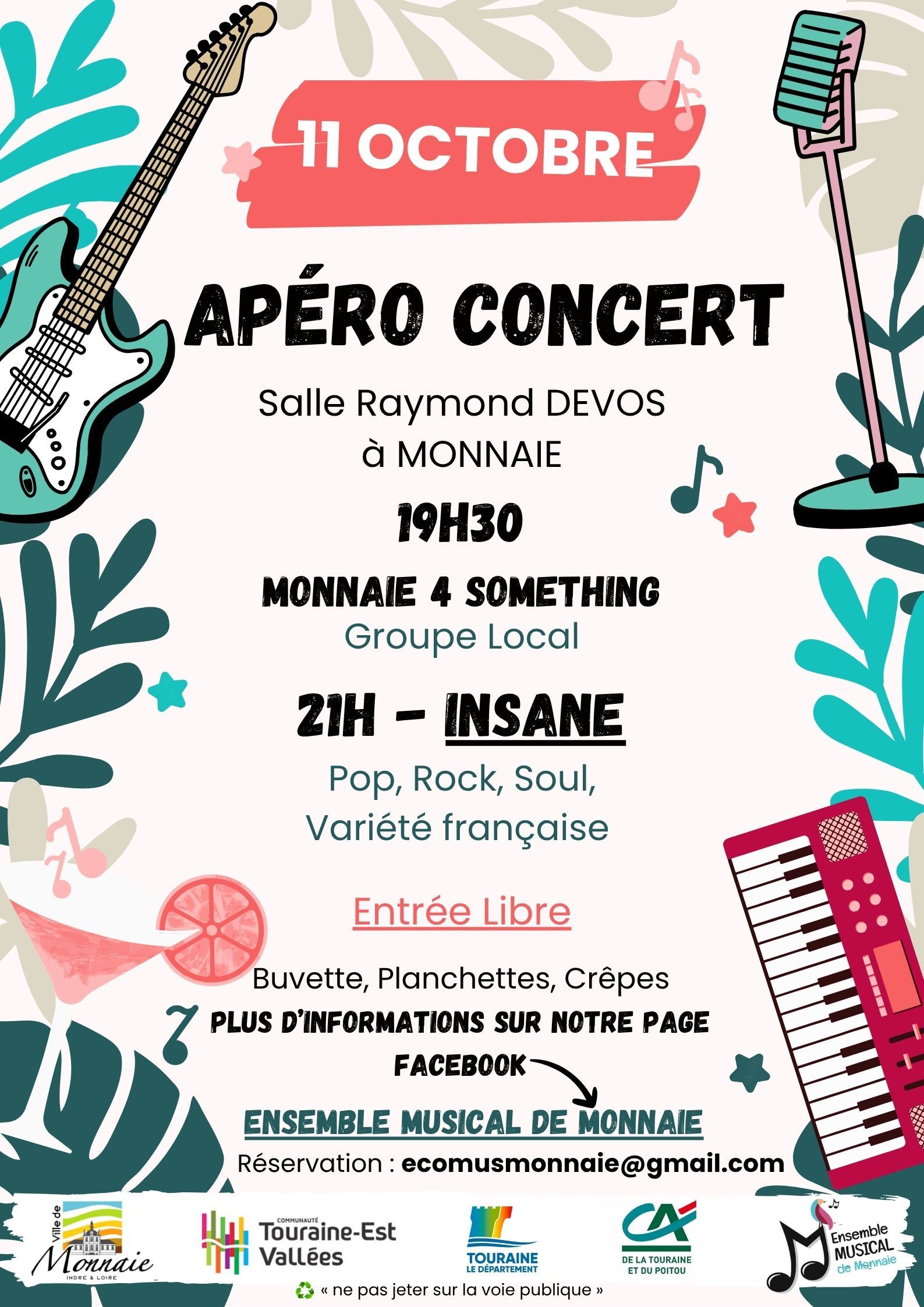 Cette soirée, organisée par l’Ensemble Musical de Monnaie, vous propose deux concerts pendant lesquels vous pourrez déguster des planches apéritifs, des crêpes, et différentes boissons ou juste profiter du spectacle. 🎸🎤🎺